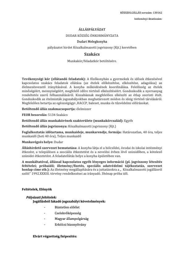 Álláshirdetés - szakács